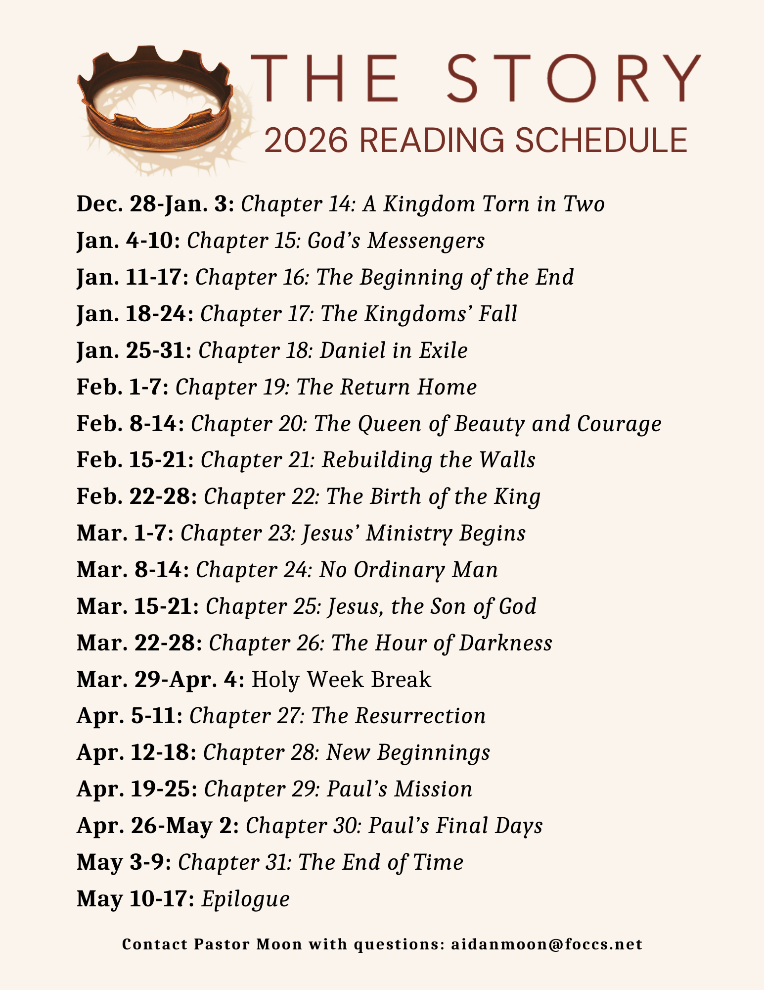 Join us as we continue exploring the Bible through the compelling program, The Story. This ongoing class is perfect for digging deeper into Scripture and discovering the Gospel woven throughout. This class meets in the kitchen. Click HERE to see the reading schedule.