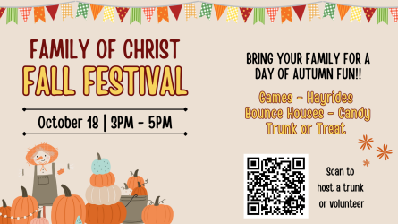 Get ready for an afternoon of festive fun for the whole family! Join us for Trunk or Treat, hayrides, bounce houses, games, and lots of candy!